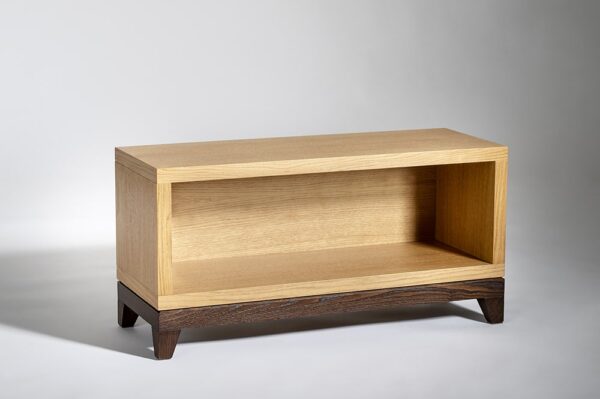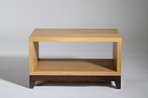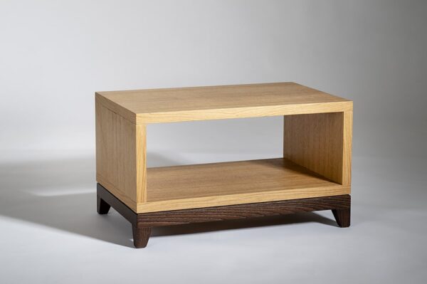 Retro aperto 70 x 45 x H 40 cm. TAVOLO FUMO con schienale 90 x 30 x H 40 cm. Struttura a pannelli placcati rovere defibrato chiaro opaco. Gambe massello rovere defibrato scuro opaco.